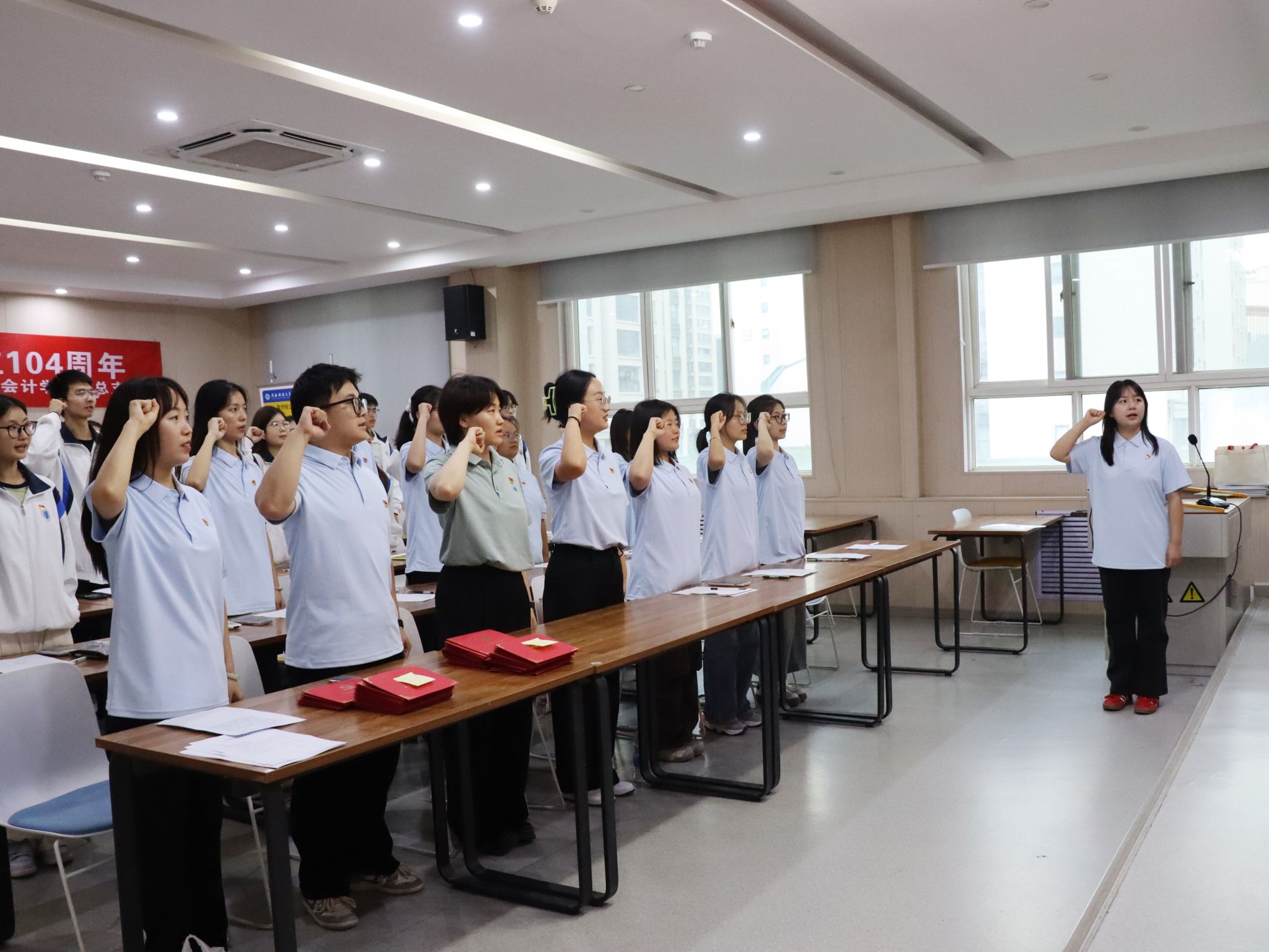国歌激荡忆峥嵘,初心如磐启新程。活动在雄壮激昂的《国际歌》声中拉开帷幕。全体师生肃立,齐声高唱,在深沉有力的旋律中,共同感悟国际共产主义运动的壮阔历程,深刻缅怀革命先辈为真理和解放事业英勇奋斗的崇高精神,凝聚起新时代青年为共产主义远大理想和中国特色社会主义共同理想持续奋斗的磅礴力量。
