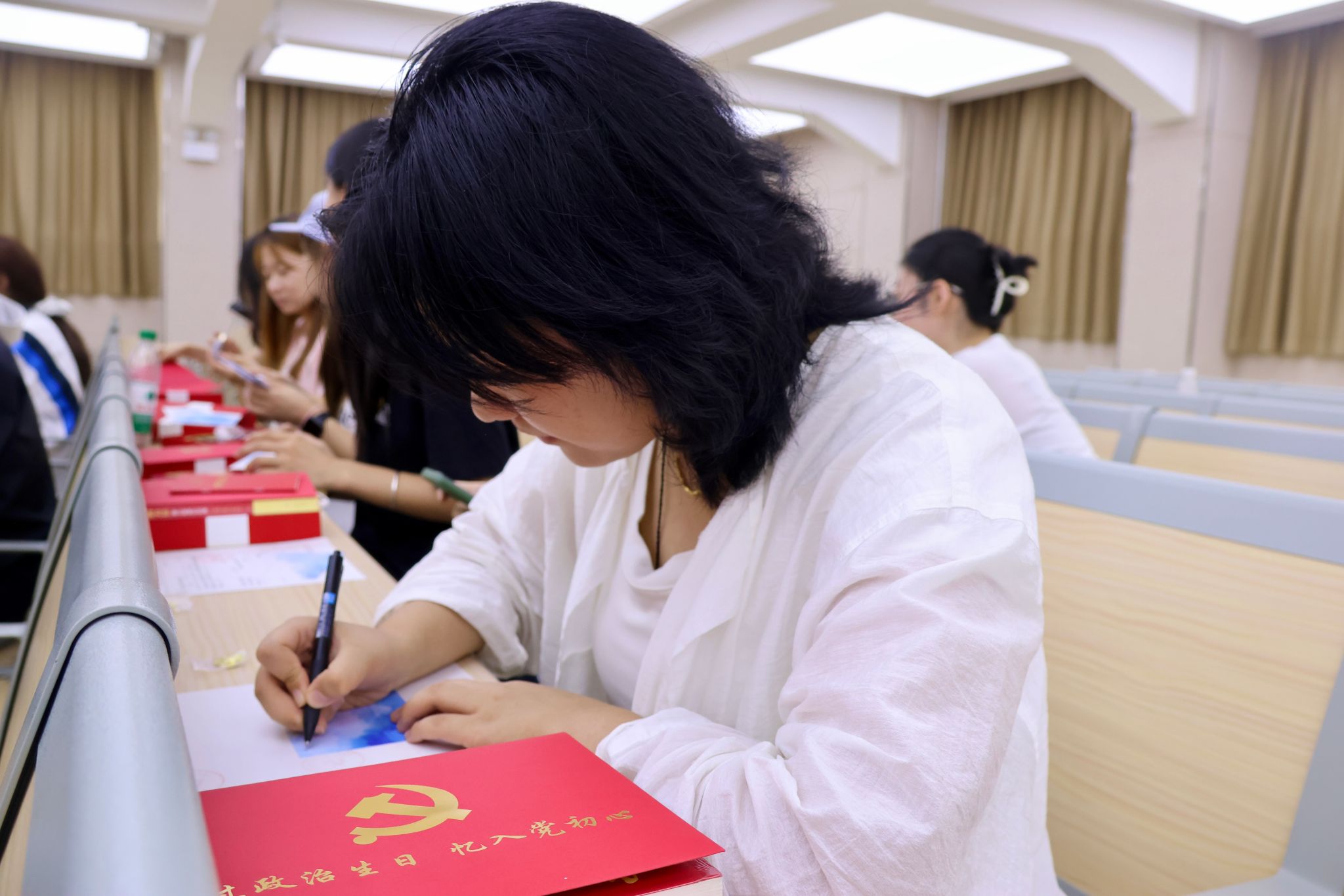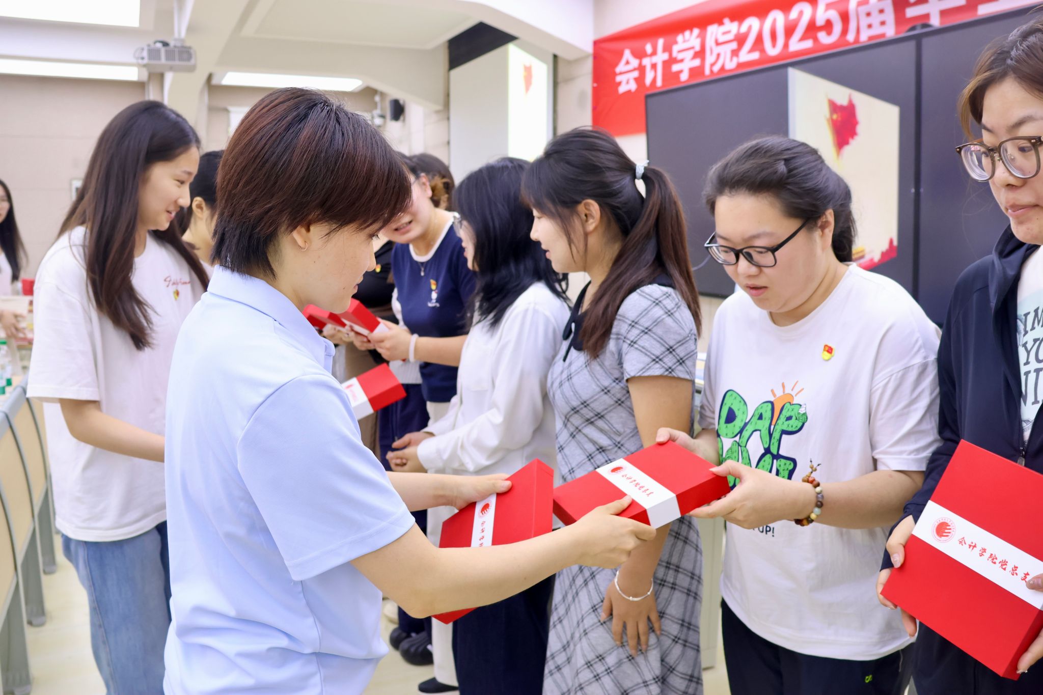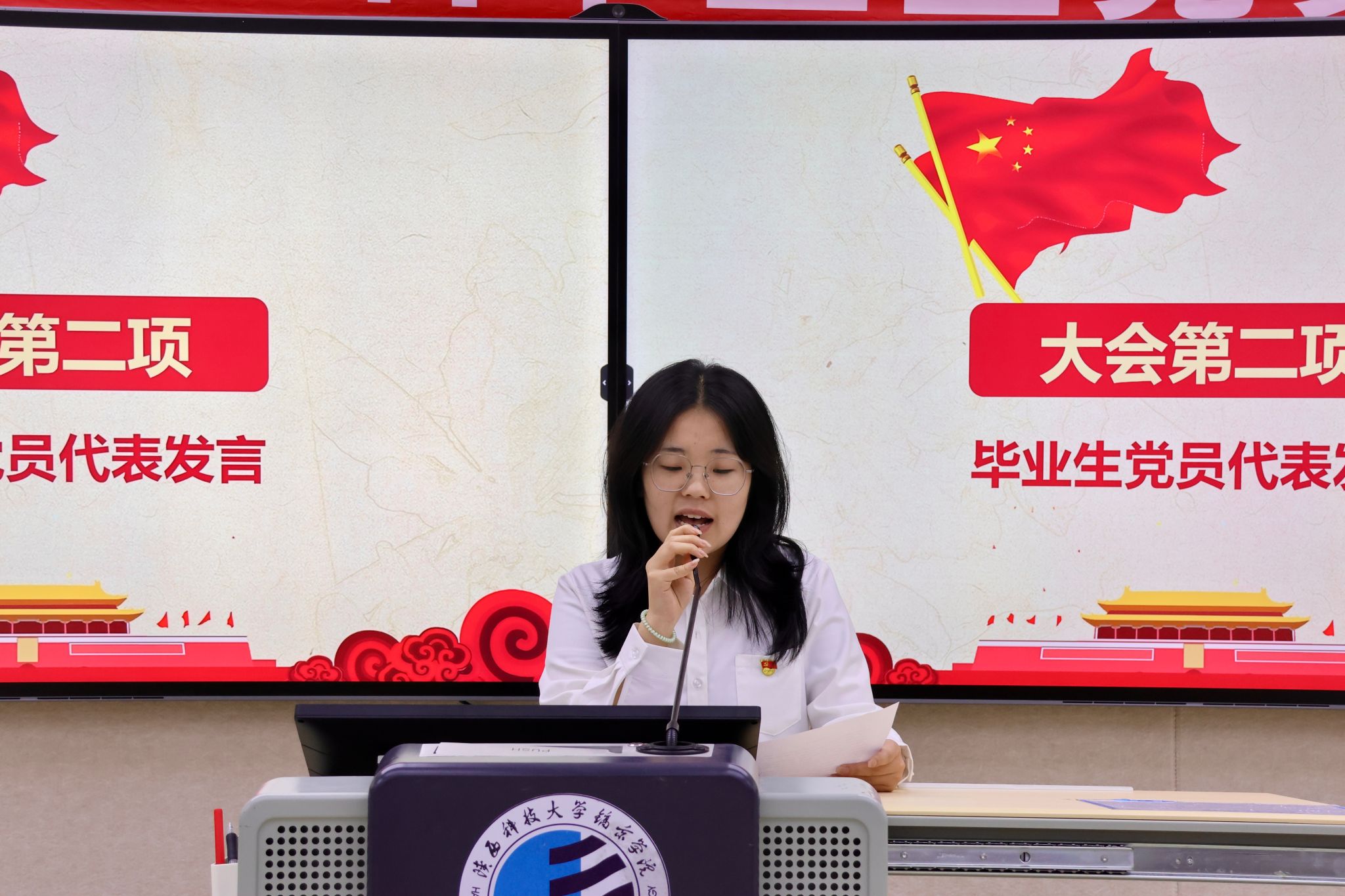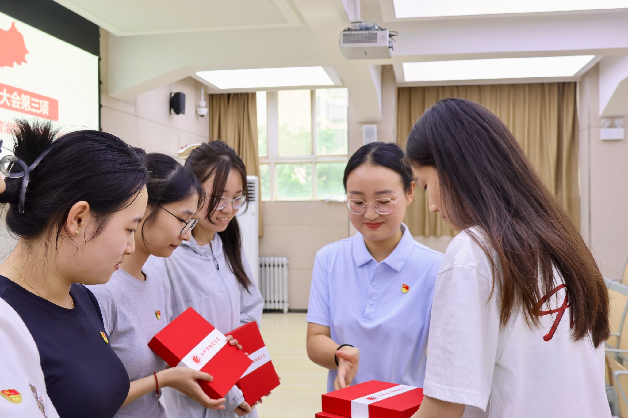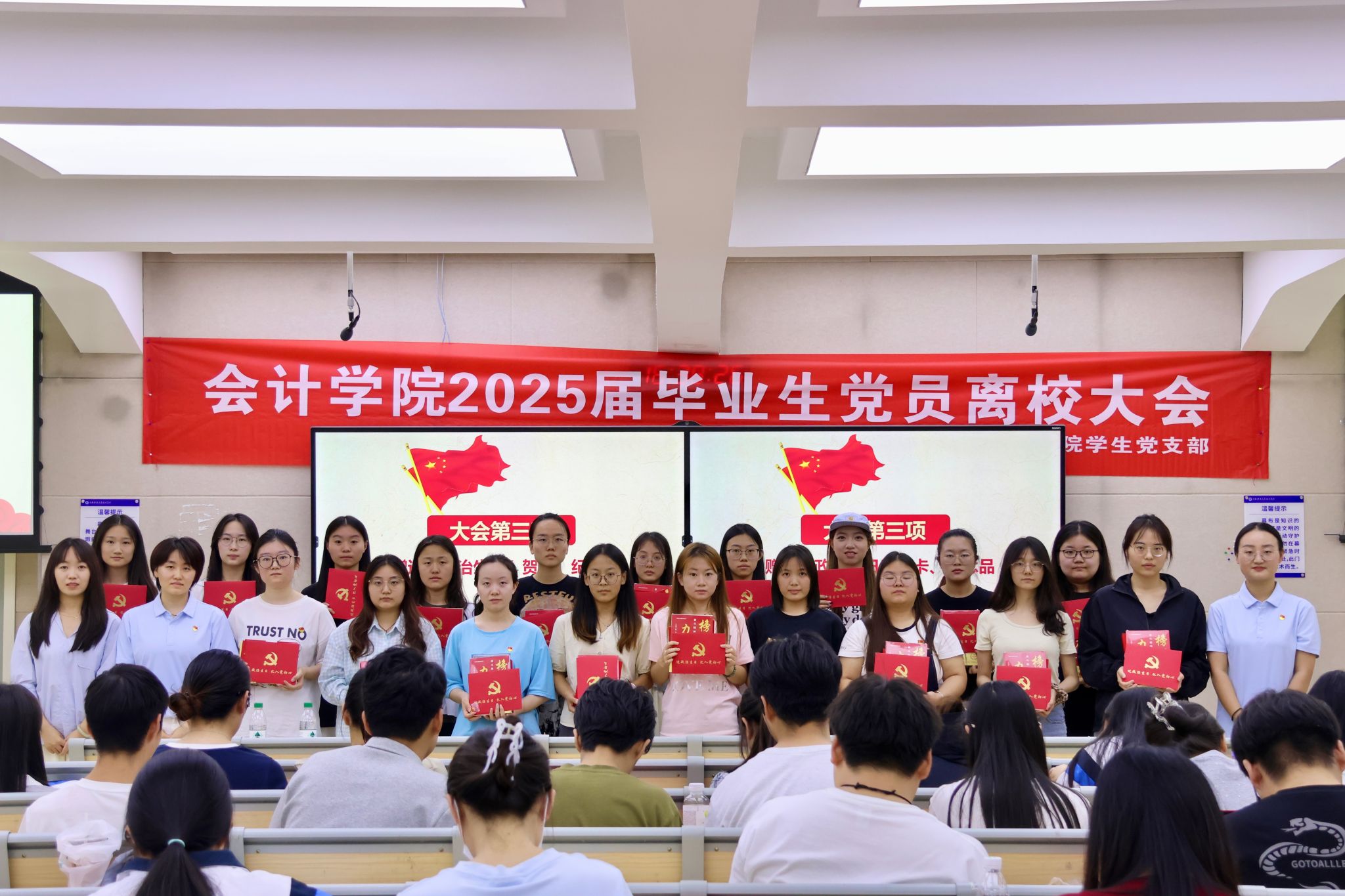 大会特别设置“初心传承”环节。三位党支部书记为毕业生党员分别赠送“政治生日”贺卡、纪念党章、红色书籍以及个人专属印章纪念品。现场多名党员表示,将把党章与书籍摆放在新岗位的案头,让理论学习成为照亮职场的“启航灯塔。”