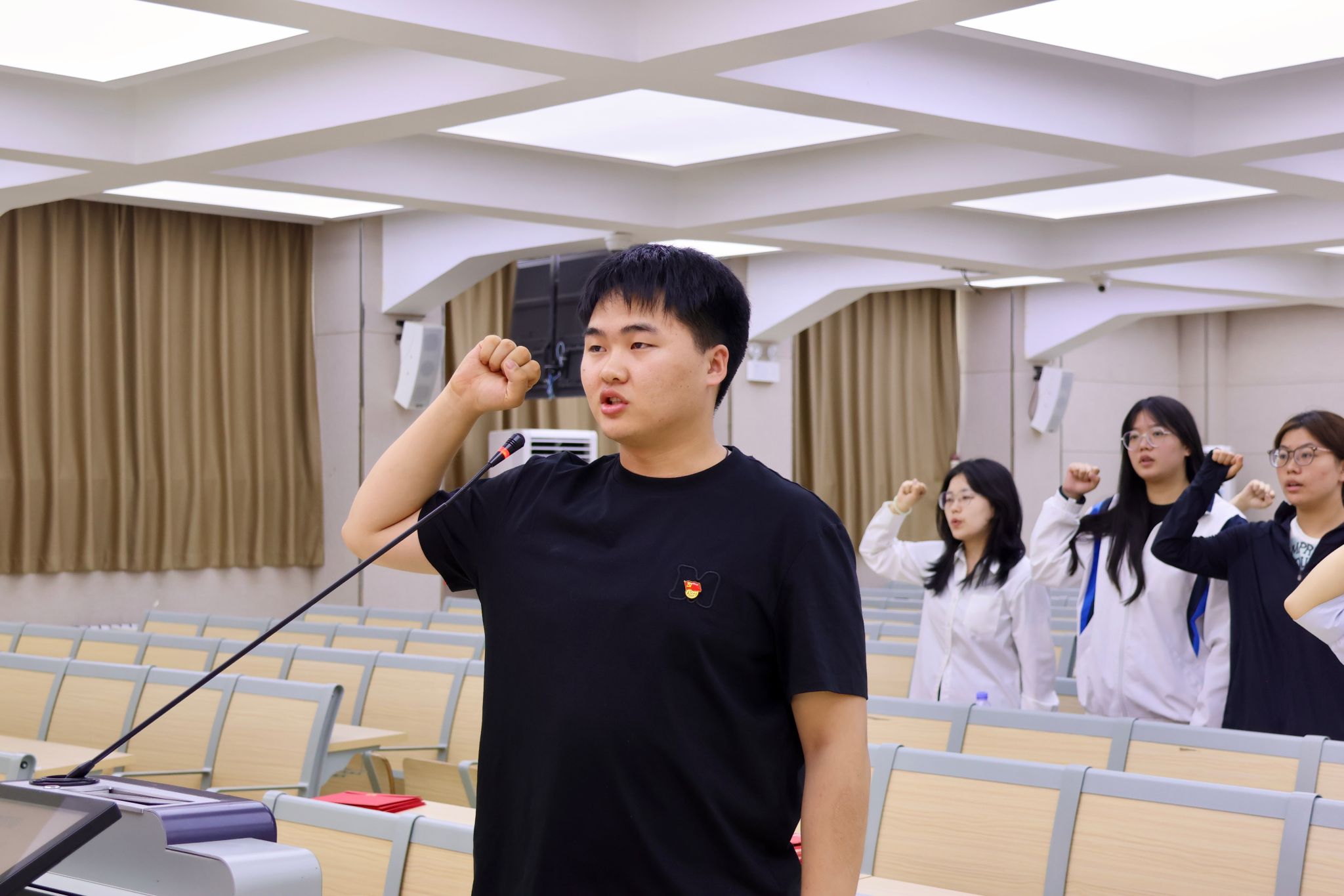 在第一员工党支部李嘉欣同志的领誓下,全体毕业生党员面向党旗庄严宣誓。铿锵誓言响彻会场,毕业生党员将始终永葆政治本色,以实际行动践行誓言。