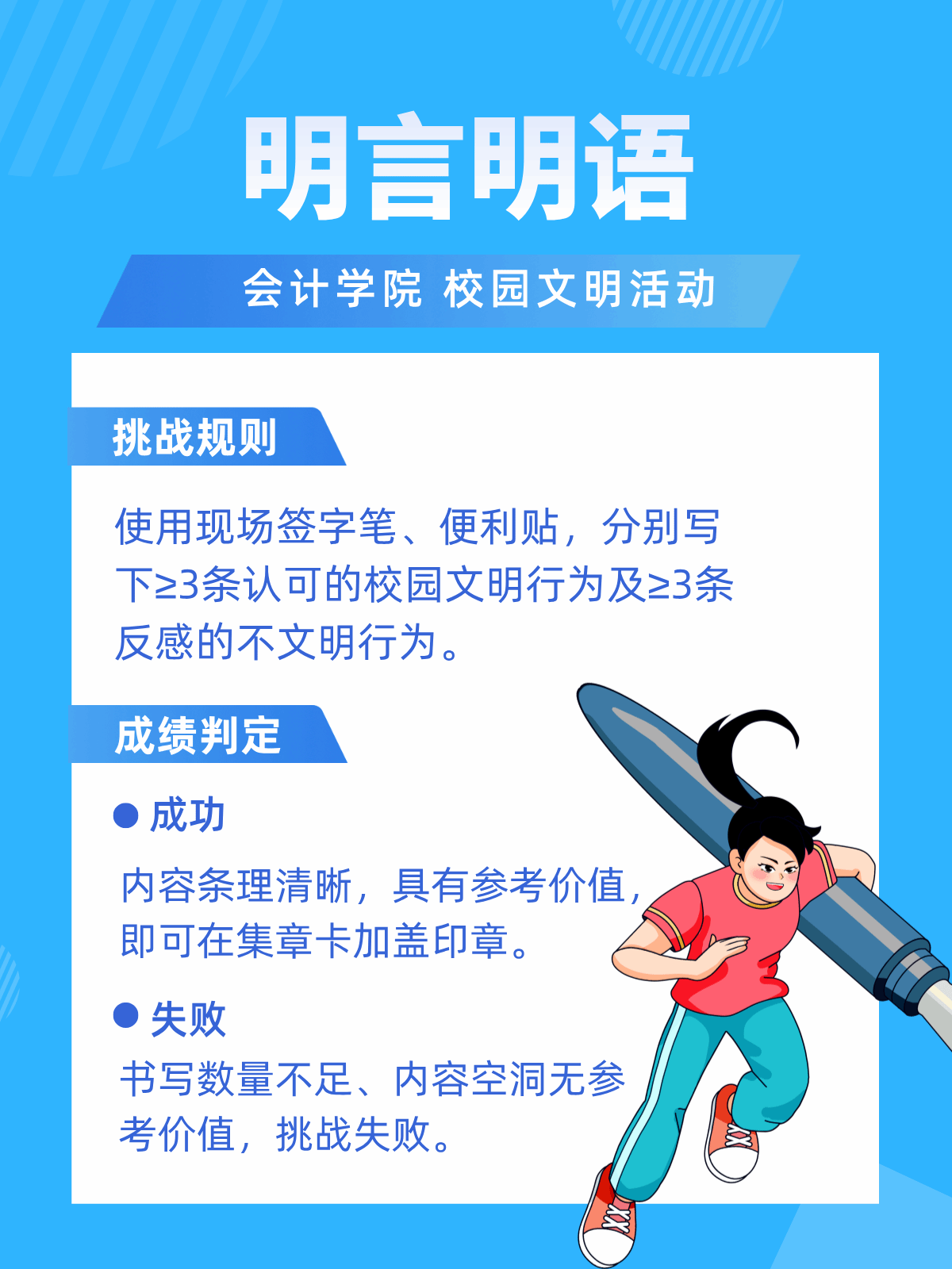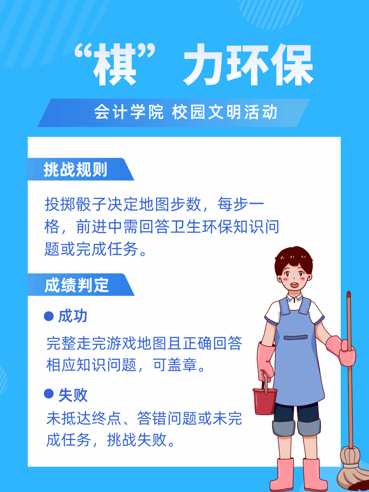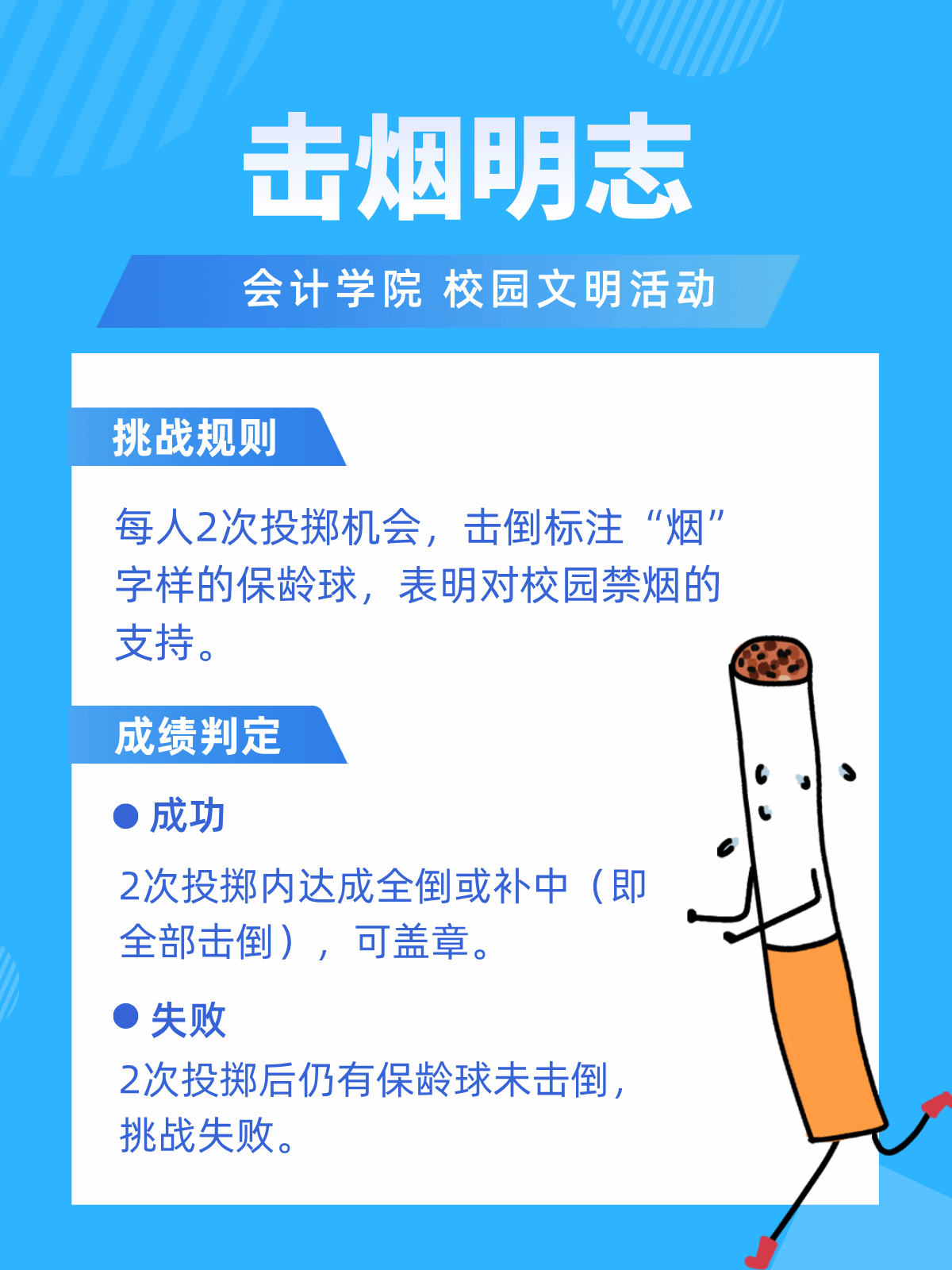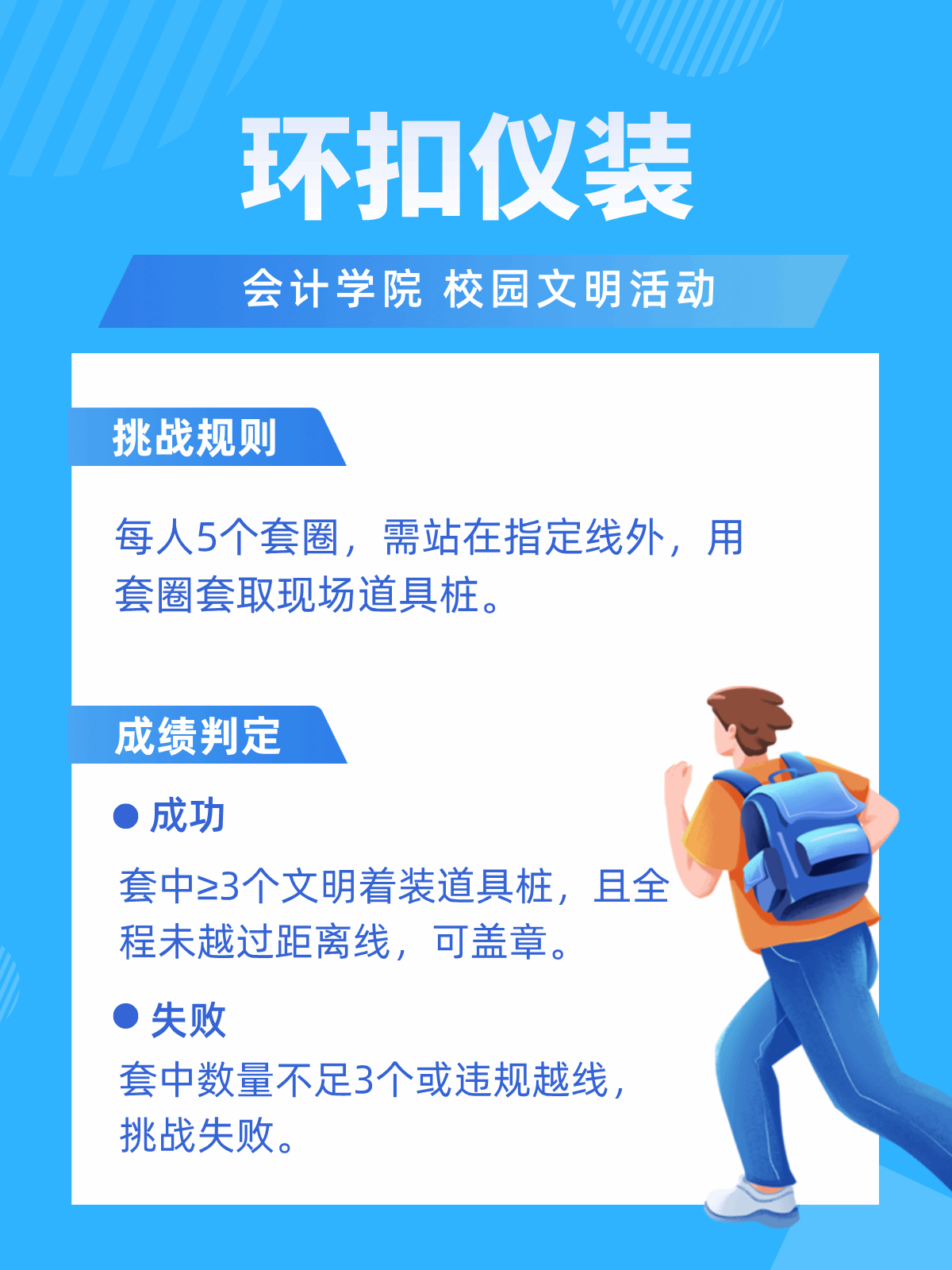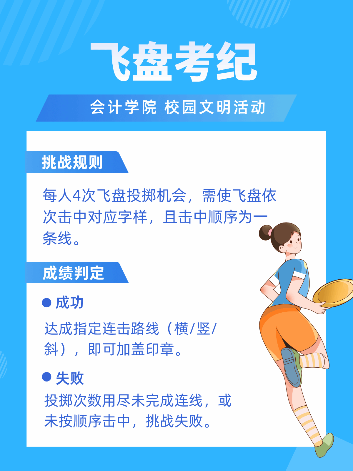 本次活动围绕卫生环保、考风考纪、网络文明、校园禁烟、文明着装等校园文明建设要求,精心策划了“明言明语”“棋力环保”“飞盘考纪”“网德视测”“击烟明志”“环扣仪装”等6个主题活动。活动内容及规则如下。