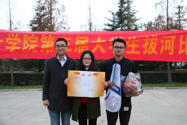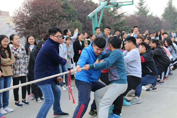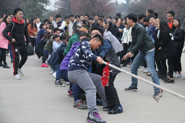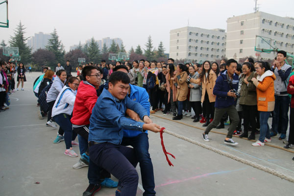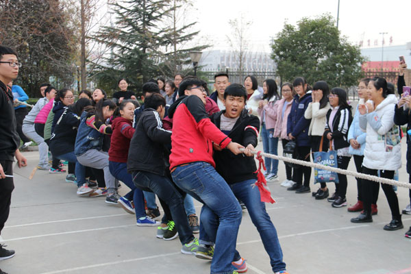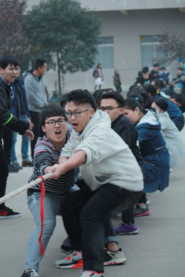 经过抽签分组,比赛于11月15日拉开帷幕。尽管天气寒冷,但是前来助威加油的人仍不在少数,同学们都为自己的班级队员呐喊加油。按照比赛规则由每班派出的18人男女混搭,决一胜负。比赛开始后,队员们齐心协力、携手并肩,啦啦队的加油声此起彼伏、如雷贯耳,赛场上尘土飞扬,赛事紧张激烈,扣人心弦,选手们交错而站,脚顶着脚,身子向后倾,双手像铁钳似的用力抓住大麻绳,咬紧了牙关,面红耳赤,用力抓紧大麻绳使劲往后拉,两对选手僵持不放,坚持不懈。各队员之间配合默契,裁判员判断精准,赛场上气氛活跃,充分显示了同学们的团结精神和踊跃参与比赛的热情。同学们的心紧紧连在一起,心里有着共同的目标,并一起努力、一起奋斗着。他们为胜利而欢呼,他们面对失败也从未气馁。