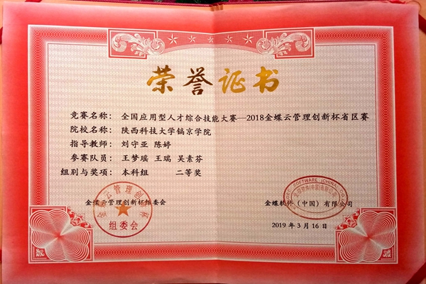 2019年3月16日第三届“金碟云管理创新杯互联网+管理应用大赛”西安赛区于西安科技大学(临潼校区)落下帷幕。镐京公司代表队从62支队伍中脱颖而出,荣获陕西省总决赛团体二等奖,刘守亚、马萍萍、张兰兰、陈婷老师获“优秀指导老师”称号。