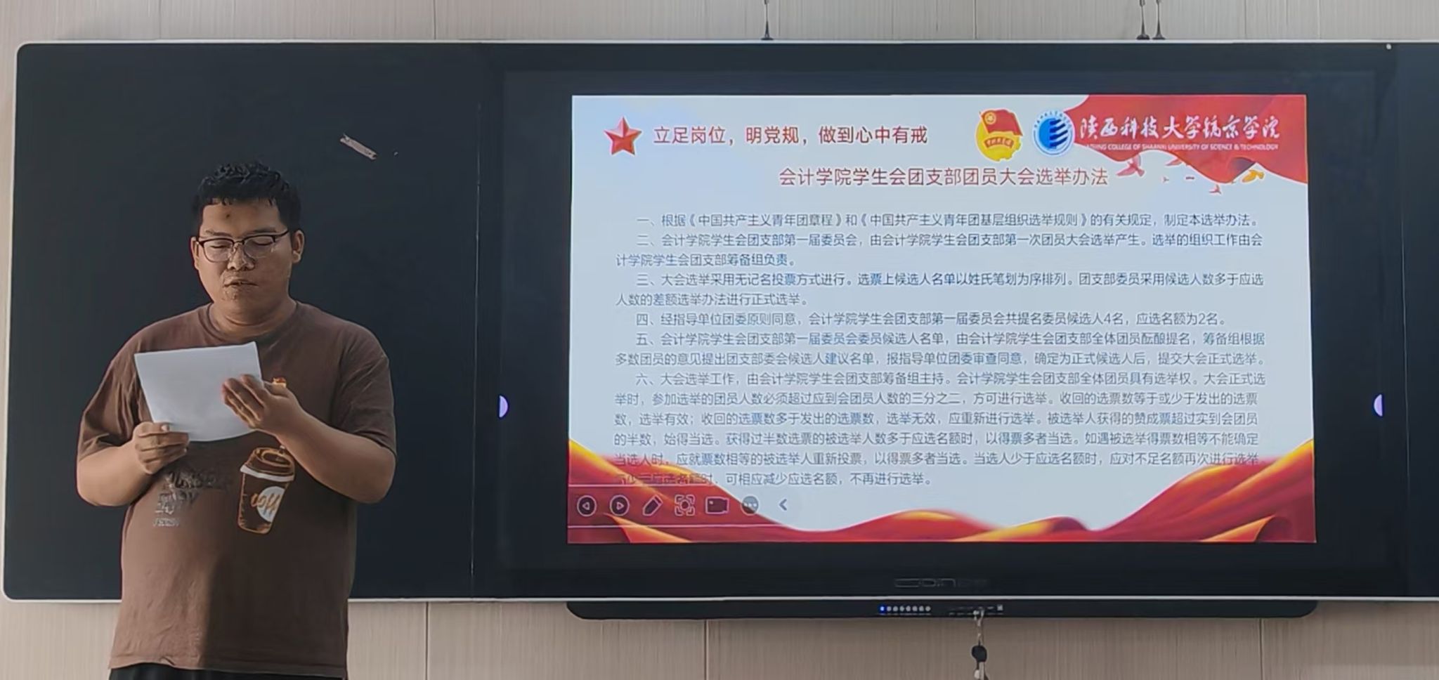 大会第二项,张瀚宇老师宣读《关于同意成立金沙城js93线路检测中心员工会功能型团支部的批复》。经共青团金沙城js93线路检测中心总支部委员会审议,同意金沙城js93线路检测中心员工会关于成立功能型团支部的议程方案、委员选举办法、大会组织流程,以及团支部委员会候选人预备人选名单和差额选举比例。