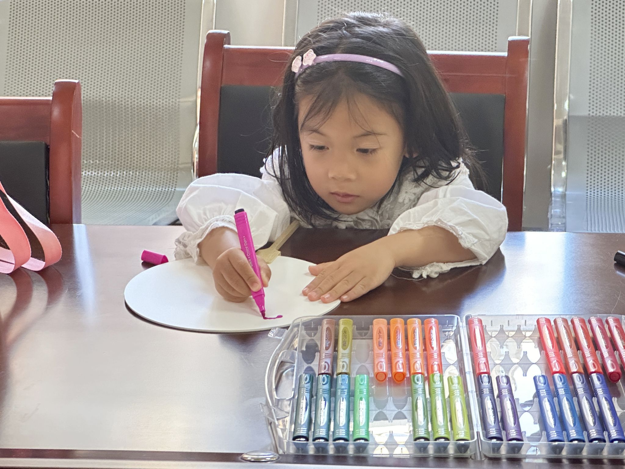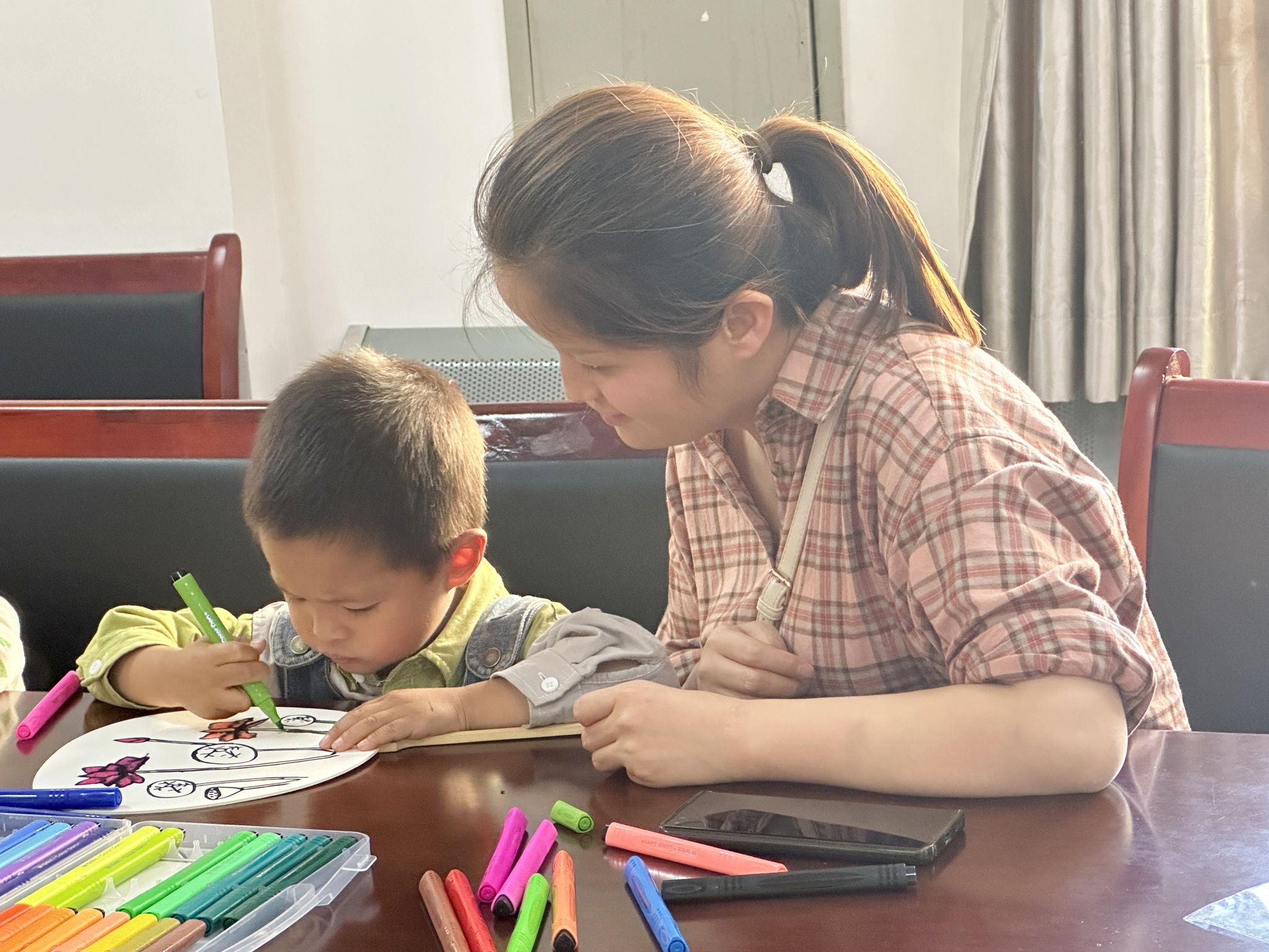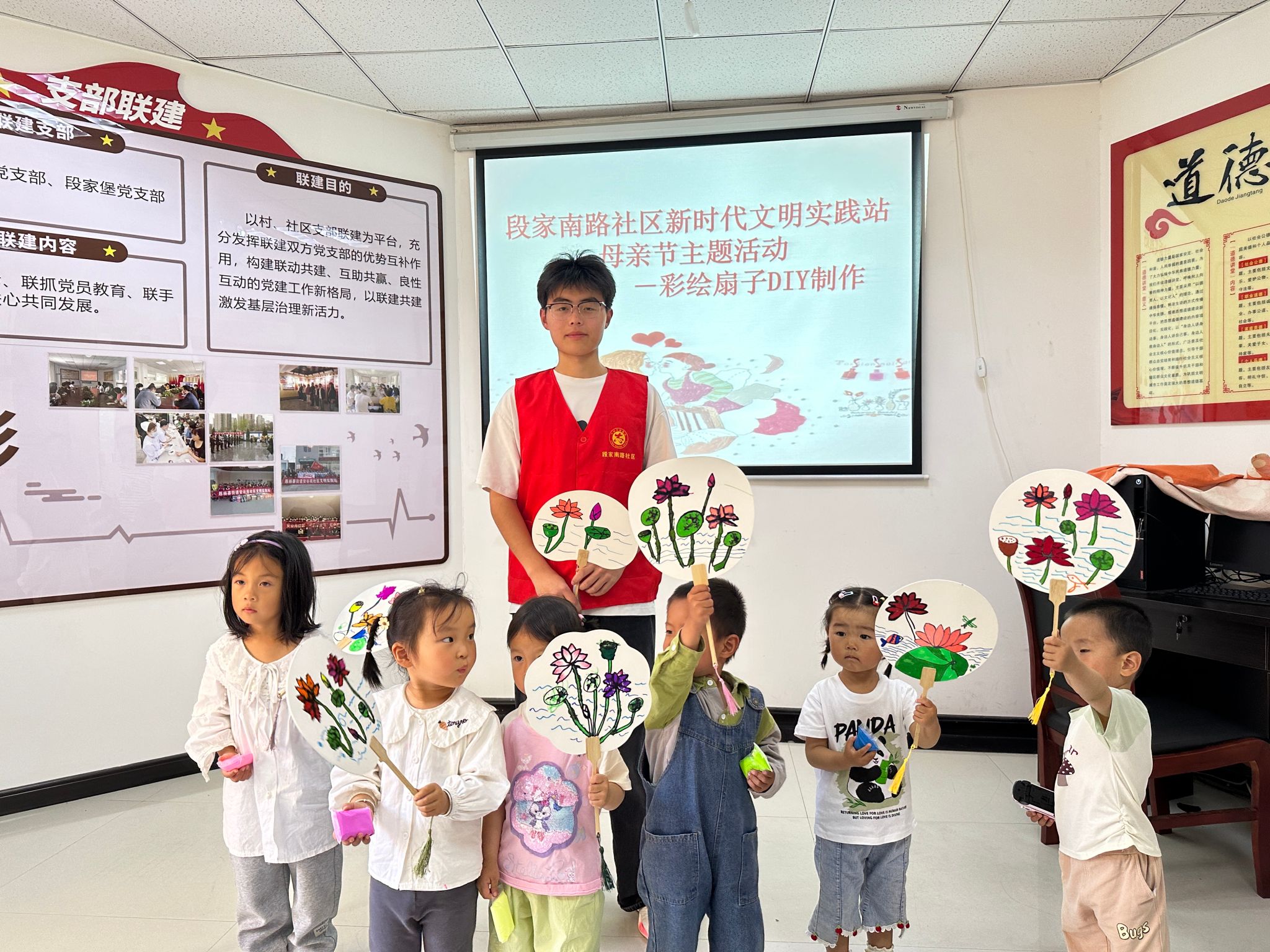 寓教于乐,以乐促学。在此次志愿活动当中,志愿者郭子晨给小朋友们带来了一堂“彩绘扇子DIY制作”课。课堂伊始,志愿者郭子晨以图片动画的形式向在场的小朋友介绍了此次彩绘的主要内容荷花,并向小朋友们科普了有关荷花的一些知识,紧接着引导小朋友们挑选了自己喜欢的扇子形状,挑出需要上色的彩笔,带着小朋友们一步一步地进行绘画,在此过程中小朋友们倍感兴趣,课堂氛围也在小朋友们的参与下逐渐活跃,促使小朋友们在玩中学学中玩,激发了孩子们的学习兴趣和探索欲望、开拓了思维、增长了知识、获得了快乐,深受小朋友们的喜爱。