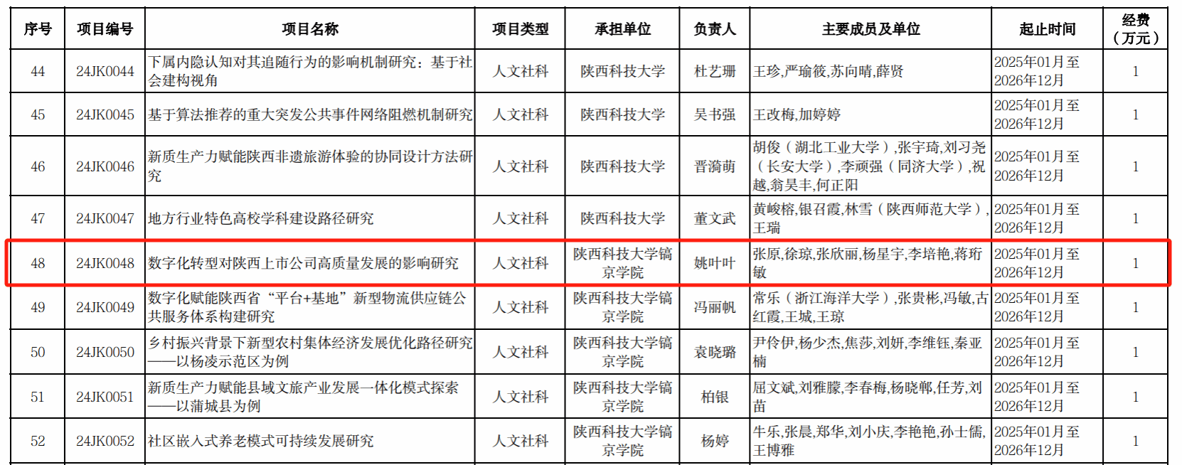 214日,陕西省教育厅发布陕教函〔202596号文件《2024年陕西省教育厅科学研究计划项目》立项通知,2024年度陕西省教育厅科学研究计划项目立项名单正式确定。在此次立项中,公司姚叶叶老师及其团队负责的数字化转型对陕西上市公司高质量发展的影响研究项目成功获批立项。