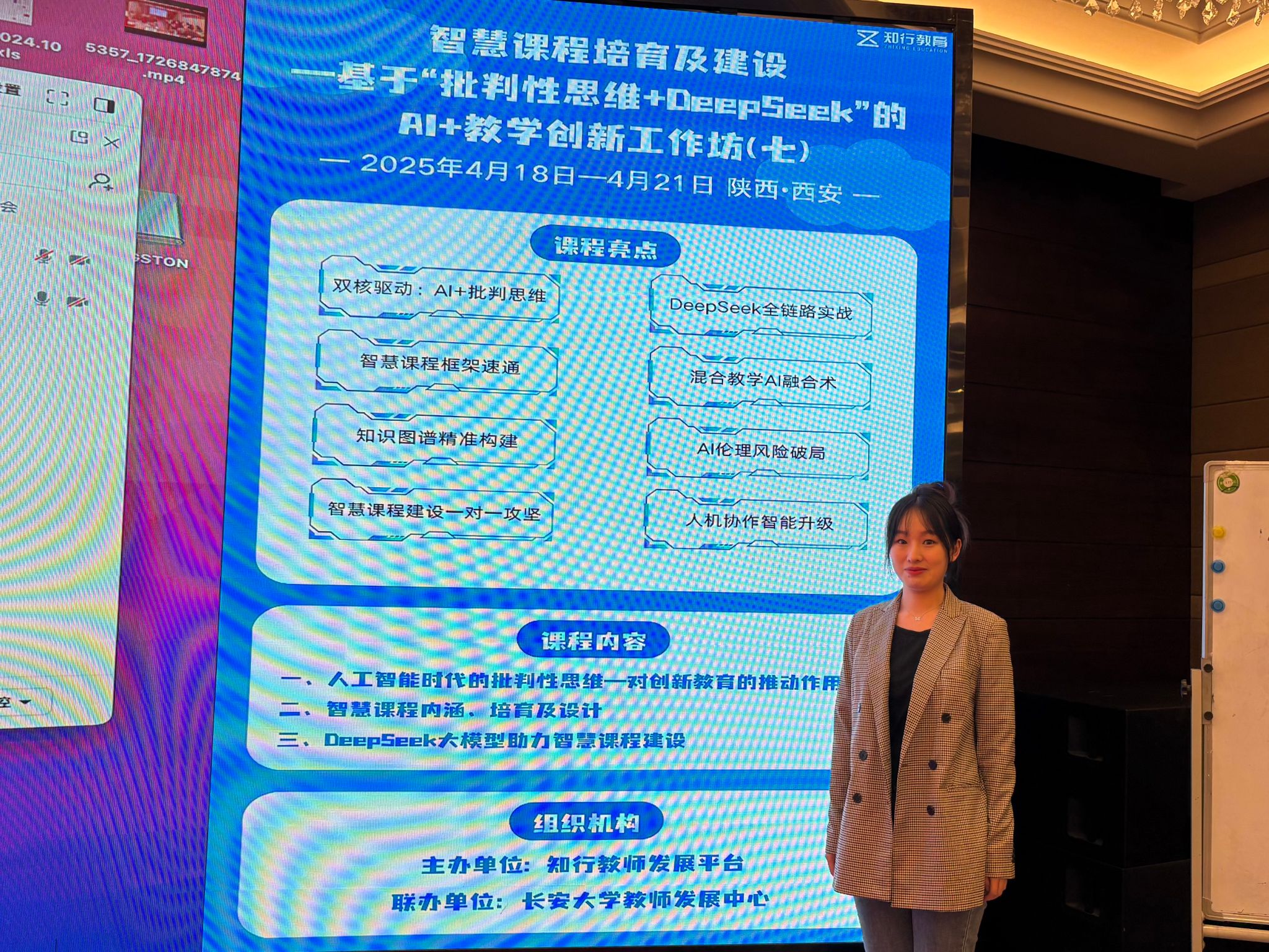 4月19日至20日,我院副经理徐琼和专任教师张皓晨参加了在西安举办的“智慧课程培育及建设——基于‘批判性思维+DeepSeek’的AI+教学创新工作坊”专项培训。本次培训聚焦人工智能时代的教育变革,探讨如何借助AI技术推动智慧课程建设,提升教学创新水平。
