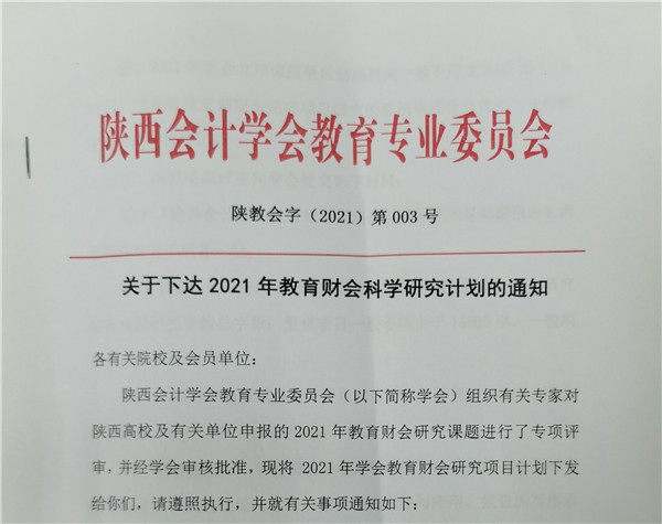 日前,陕西会计学会教育专业委员会《关于下达2021年教育财会科学研究计划的通知》(陕教会字〔2021〕第003号)公布了2021年陕西会计学会教育专业委员会科研项目立项结果,全省计划立项41项,公司获批1项,这是公司近...