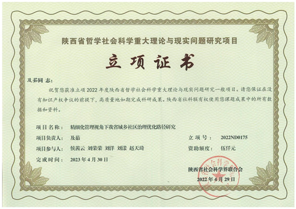 4月29日,陕西省社会科学界联合会《关于公布 2022 年度陕西省哲学社会科学重大理论与现实问题研究一般项目立项结果的通知》(陕社科联〔2022〕40号)文件公布了2022 年度一般项目(青年项目)课题研究项目立项情况,...