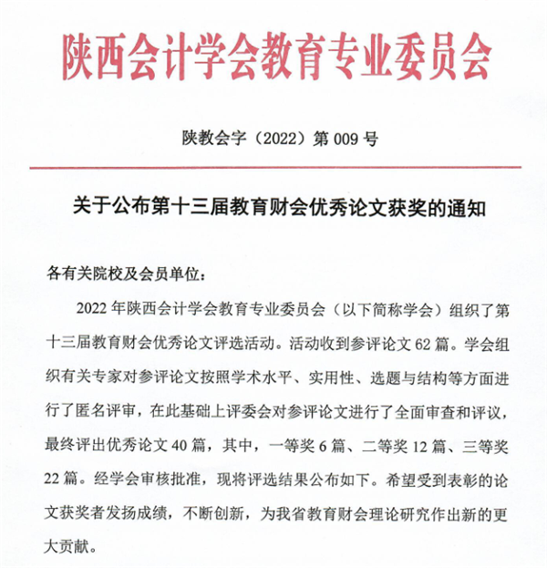 公司获批2022年度陕西会计学会教育课题2项及第十三届教育财会优秀论文1篇